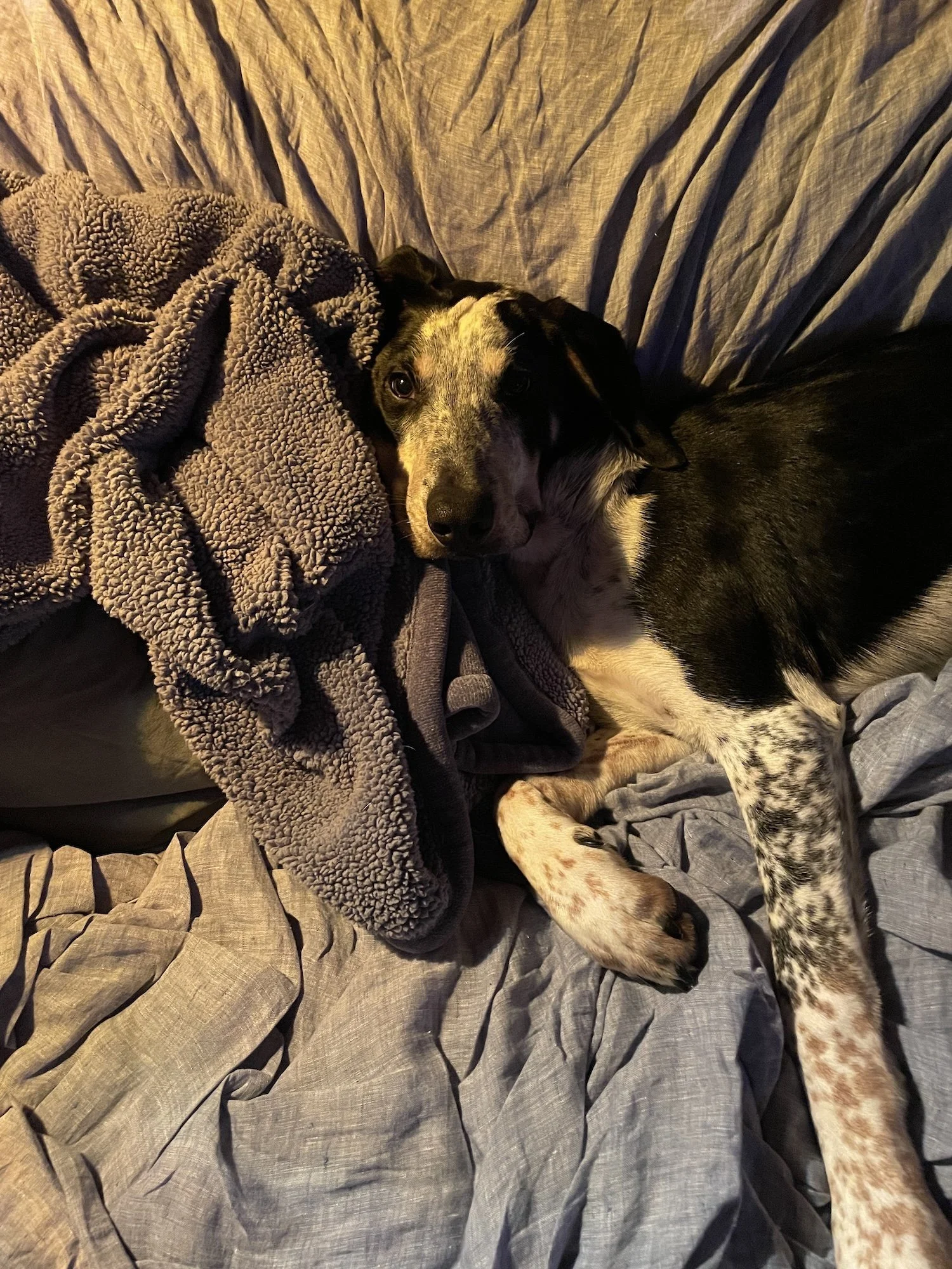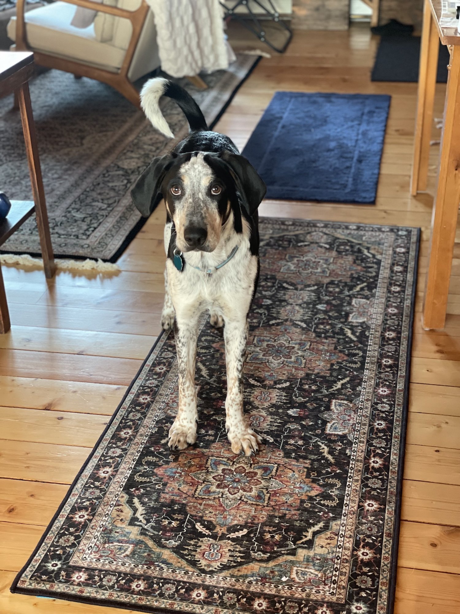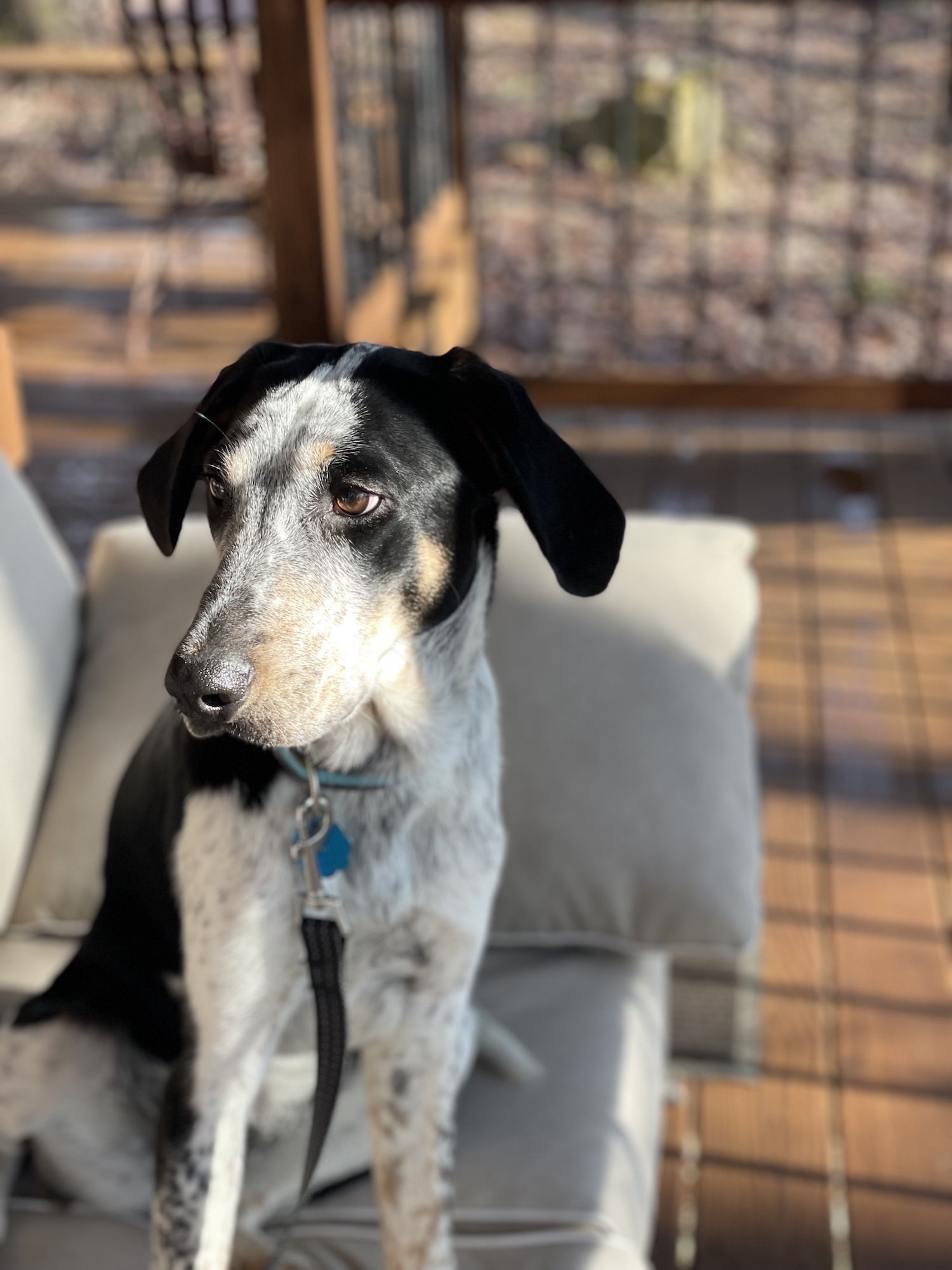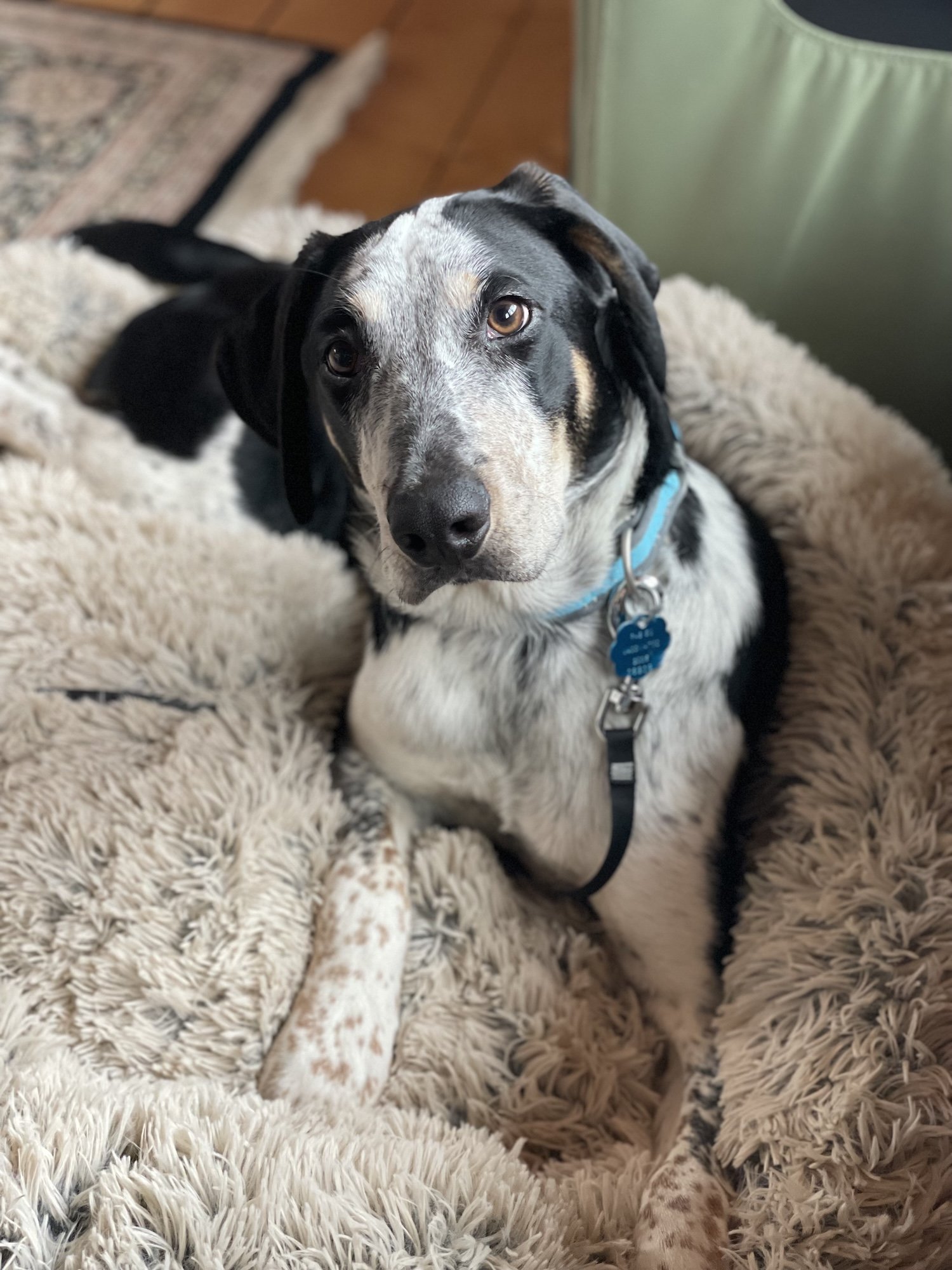 Huck is a sweet, fun loving guy . He is 9 months old and has a silky coat weighing in at 43 pounds. Huck would love to find his new home with someone ready for a young dog that has a nice start on his training. Huck is an affectionate and tolerant hound mix. He hasn’t met any children yet. He likes attention and playtime outside or with toys and chews inside. Huck cuddles up on the couch and watches movies at the end of the day. He is crate trained and has been sleeping quietly at night and resting during the day. Huck does well with his potty training and is keeping to a good routine. He enjoys sniffing walks on a leash or in a fenced yard. Huck is working hard on short training sessions like waiting at the door, walking nicely on the leash and respecting his handlers personal space. He has started training on place, sit, settling calmly while watching distractions like birds and rabbits in the yard. Huck has been on outings to the groomer for nail trimming and to Farm and Fleet for some shopping. He did fantastic and made some new friends. He is a typical young adolescent that is curious but can also startle if he doesn’t understand something yet. With a little time and a patient friend to teach him how things work and what is expected, he will reward you with years of loyal company and fun adventures.